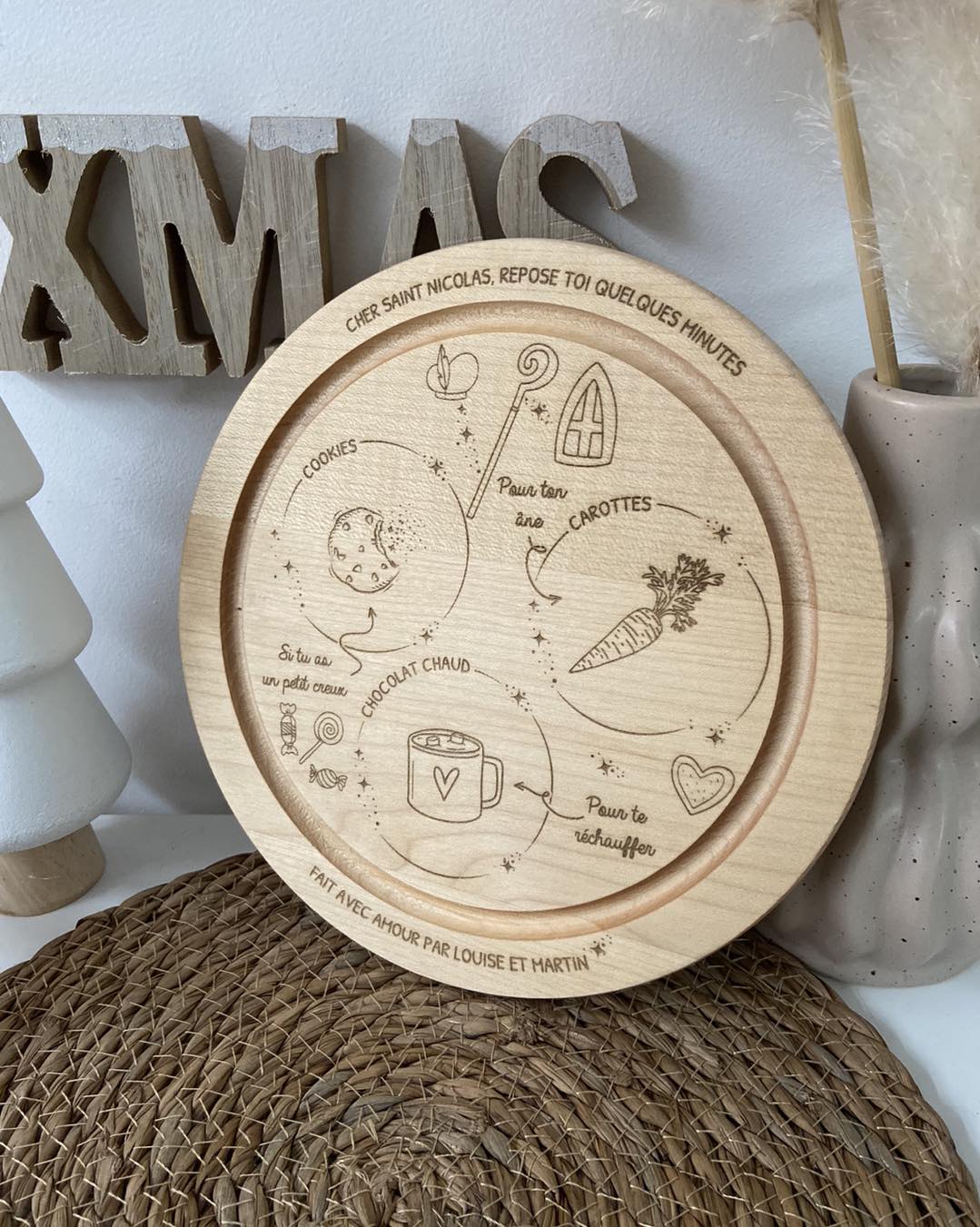 Cette planche ronde gravée (diamètre 23 cm) est personnalisée avec le(s) prénom(s) de votre(vos) enfant(s). Parfaite pour déposer les cookies, la carotte de l’âne et le chocolat chaud ✨