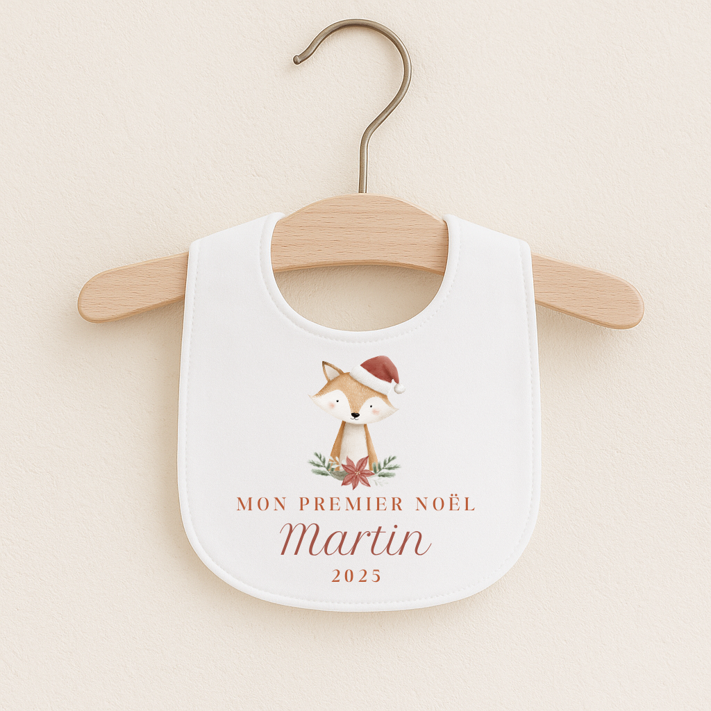 Un bavoir blanc en coton tout doux, fermeture à pression à l’arrière, personnalisé avec la mention “Mon premier Noël” + prénom + date. Motif au choix pour un souvenir à croquer 🎄