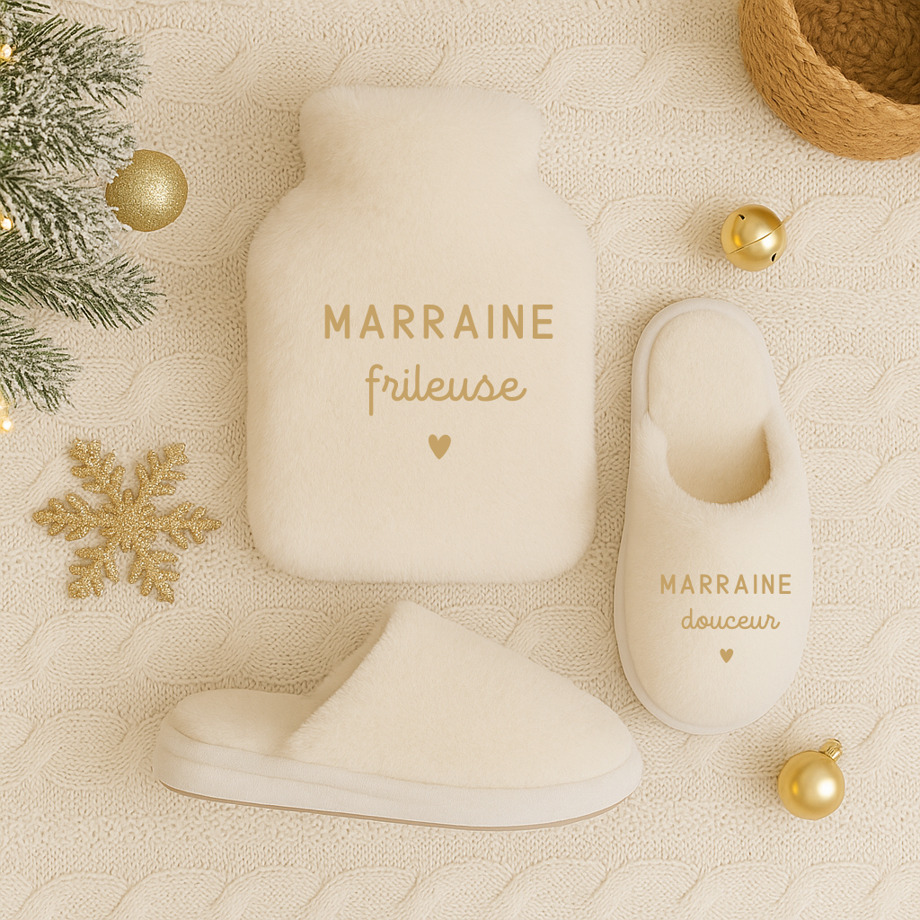 Le duo cocooning parfait pour réchauffer les cœurs (et les pieds) 💛 Personnalisez l’inscription pour une marraine, une amie, une maman… ou vous-même !