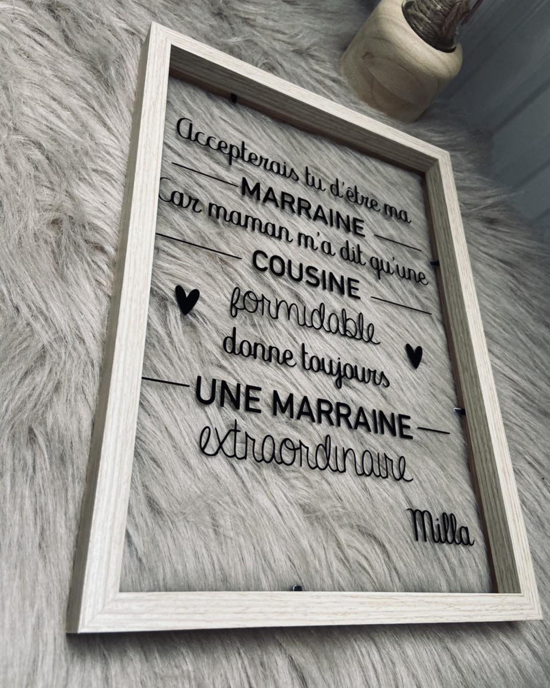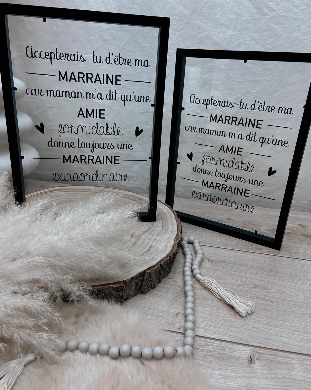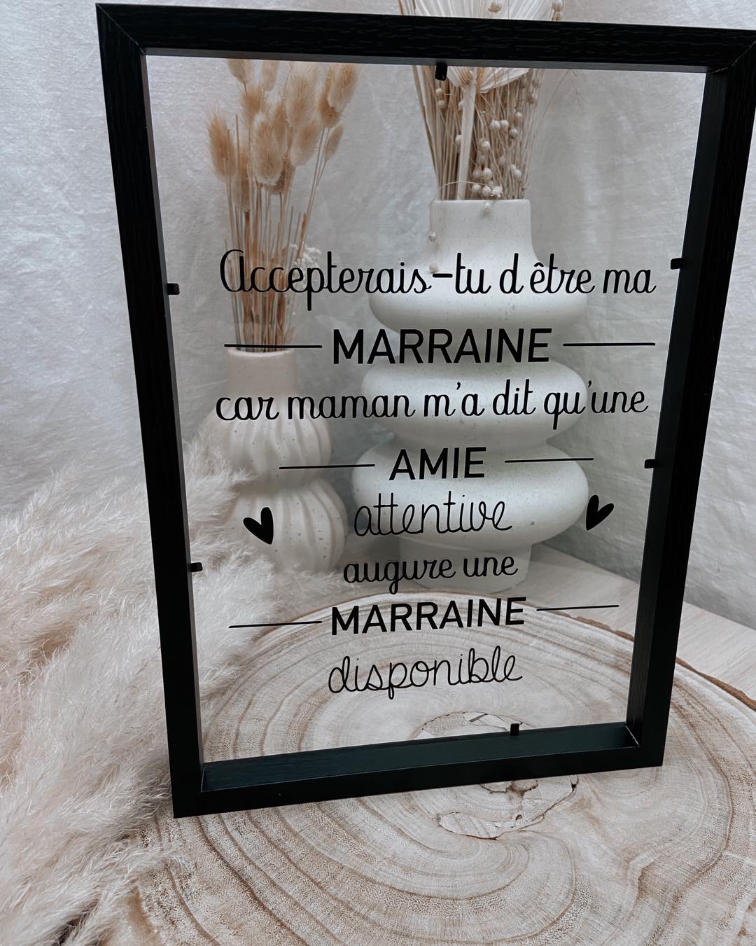 Un cadre en verre au look moderne pour une annonce pleine d’émotions. Design mots entremêlés : le rôle en grand (ex. MARRAINE) et le prénom au centre. Possibilité d’ajouter une date ou une petite phrase ✨