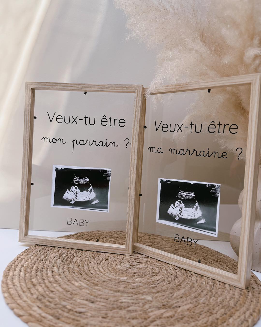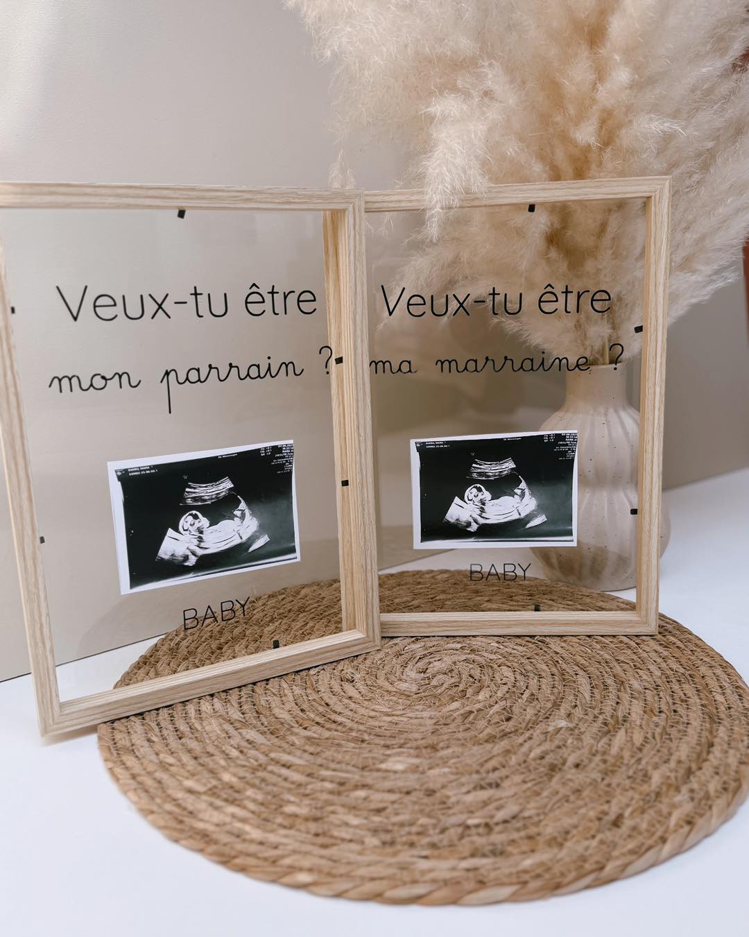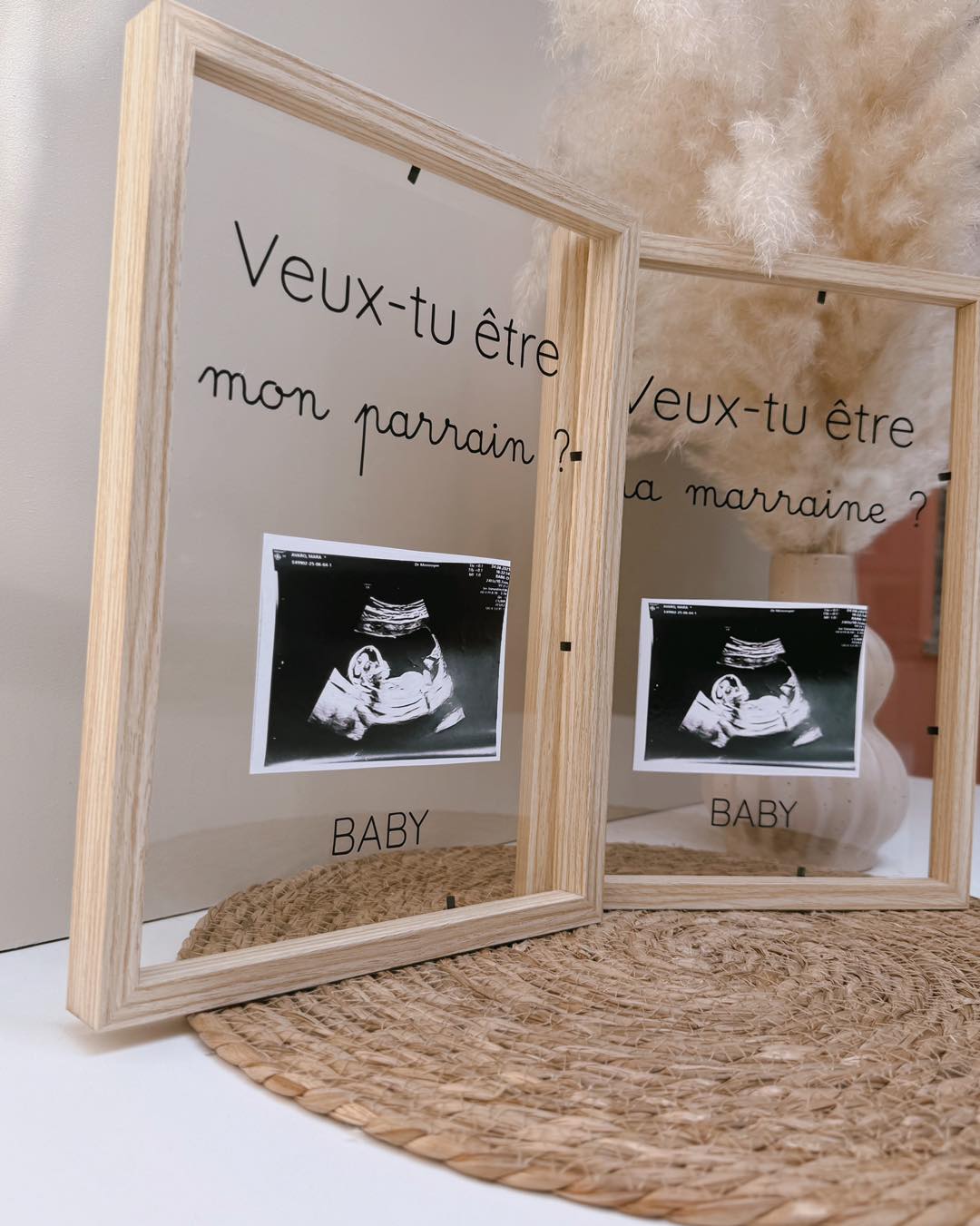 Faites votre annonce avec un cadre A4 au rendu aérien : texte en vinyle posé sur une plaque en verre et photo d’échographie (ou photo) fixée au centre. Disponible en bois naturel ou noir pour s’accorder à tous les intérieurs.