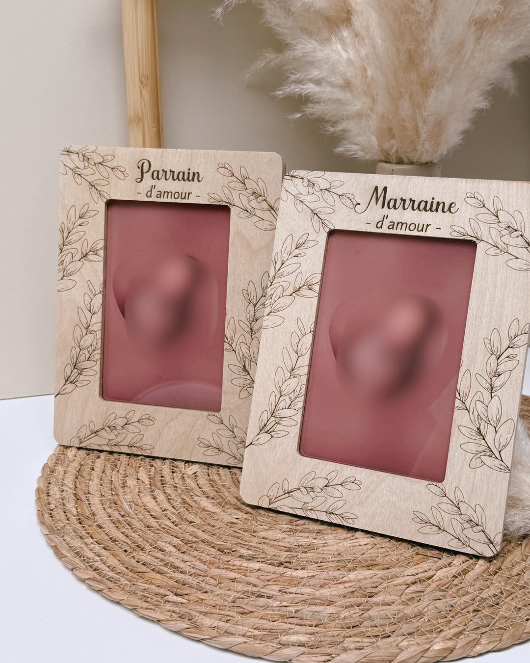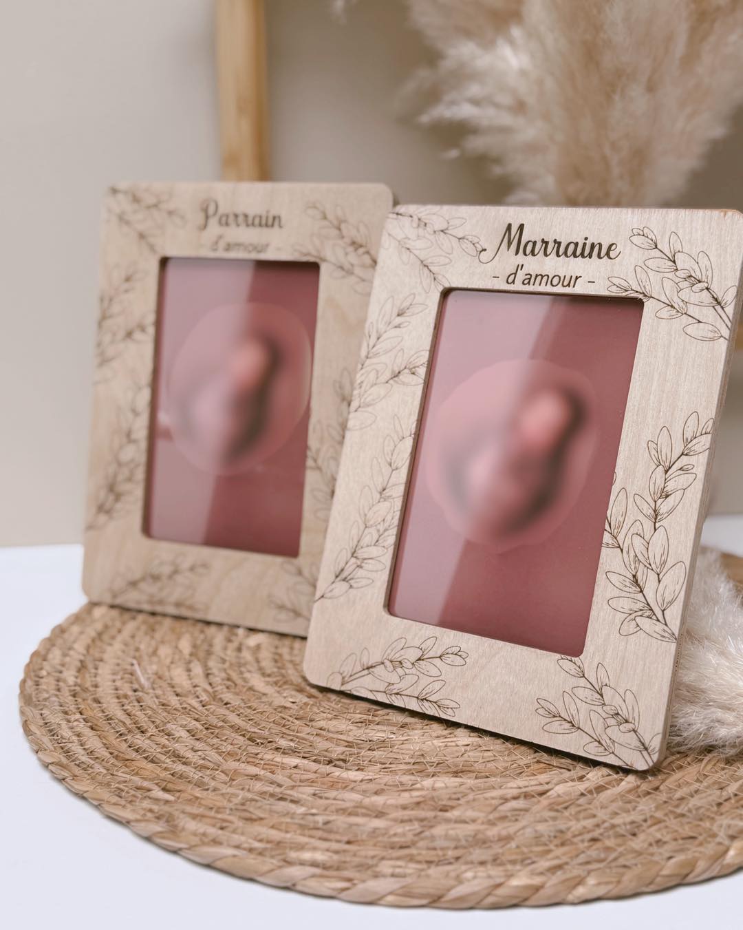 Un cadre délicat en bois véritable, gravé au laser avec un motif feuillage. Parfait pour une demande, un merci ou un joli souvenir (marraine, parrain, mamie, papy… au choix).