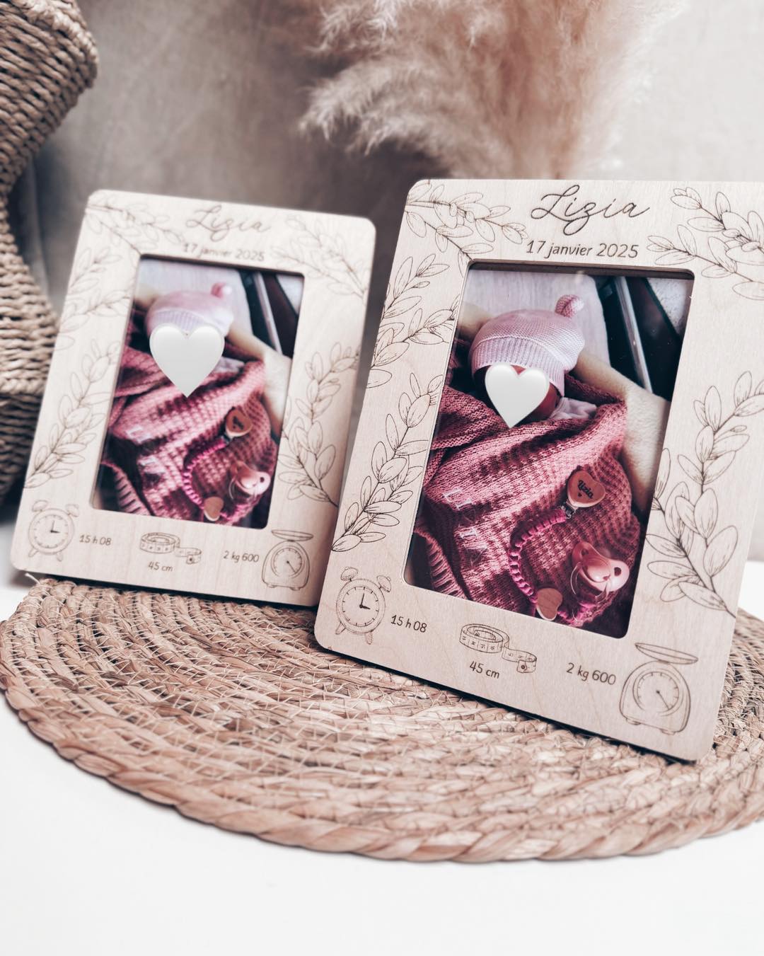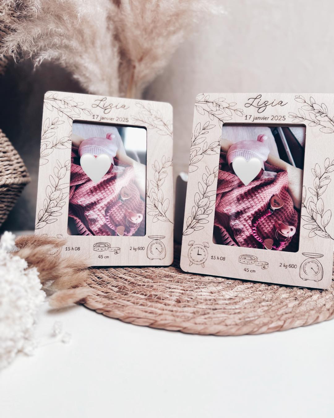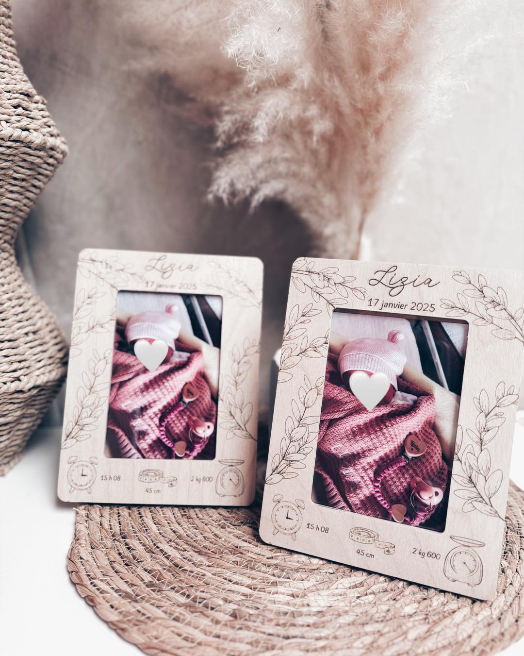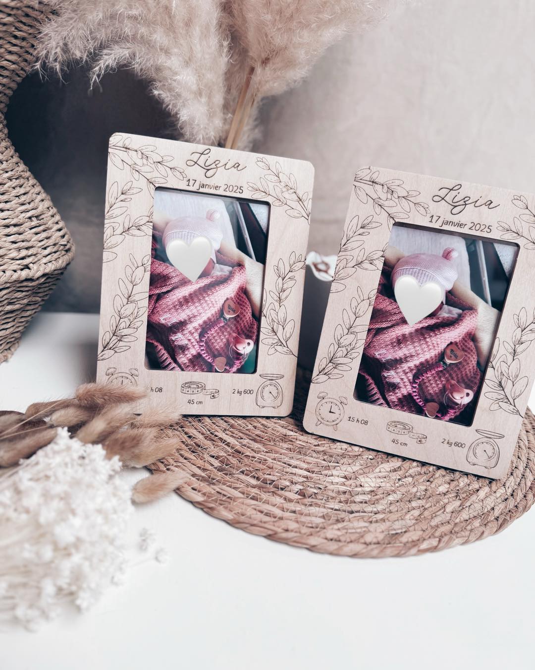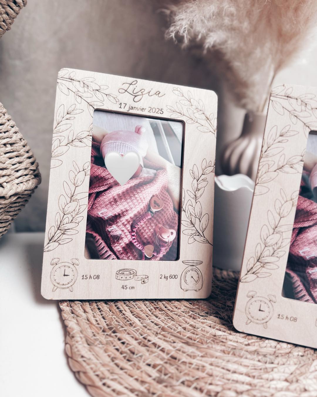 Un cadre en bois gravé au motif feuillage, qui immortalise les informations de naissance de bébé (prénom, date, heure, taille, poids) avec sa photo imprimée et insérée par mes soins. Un souvenir doux et naturel à poser dans la chambre ou à offrir aux proches 🤍