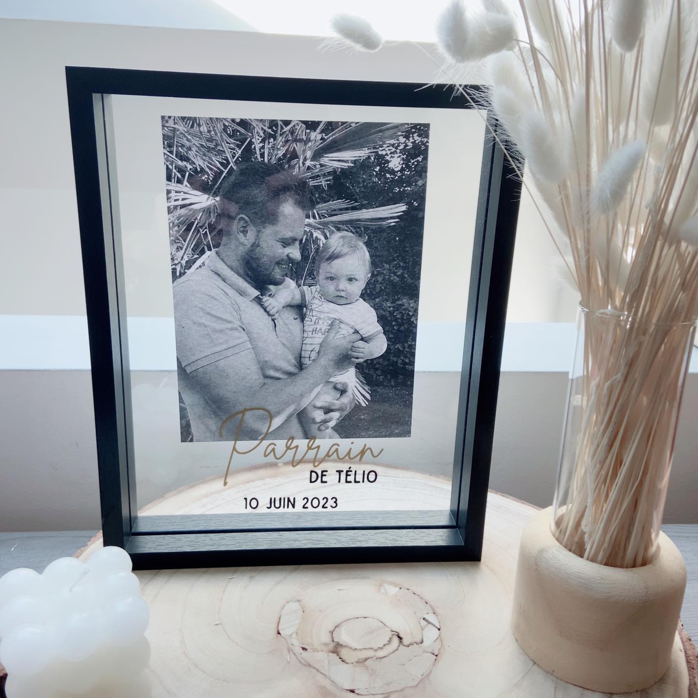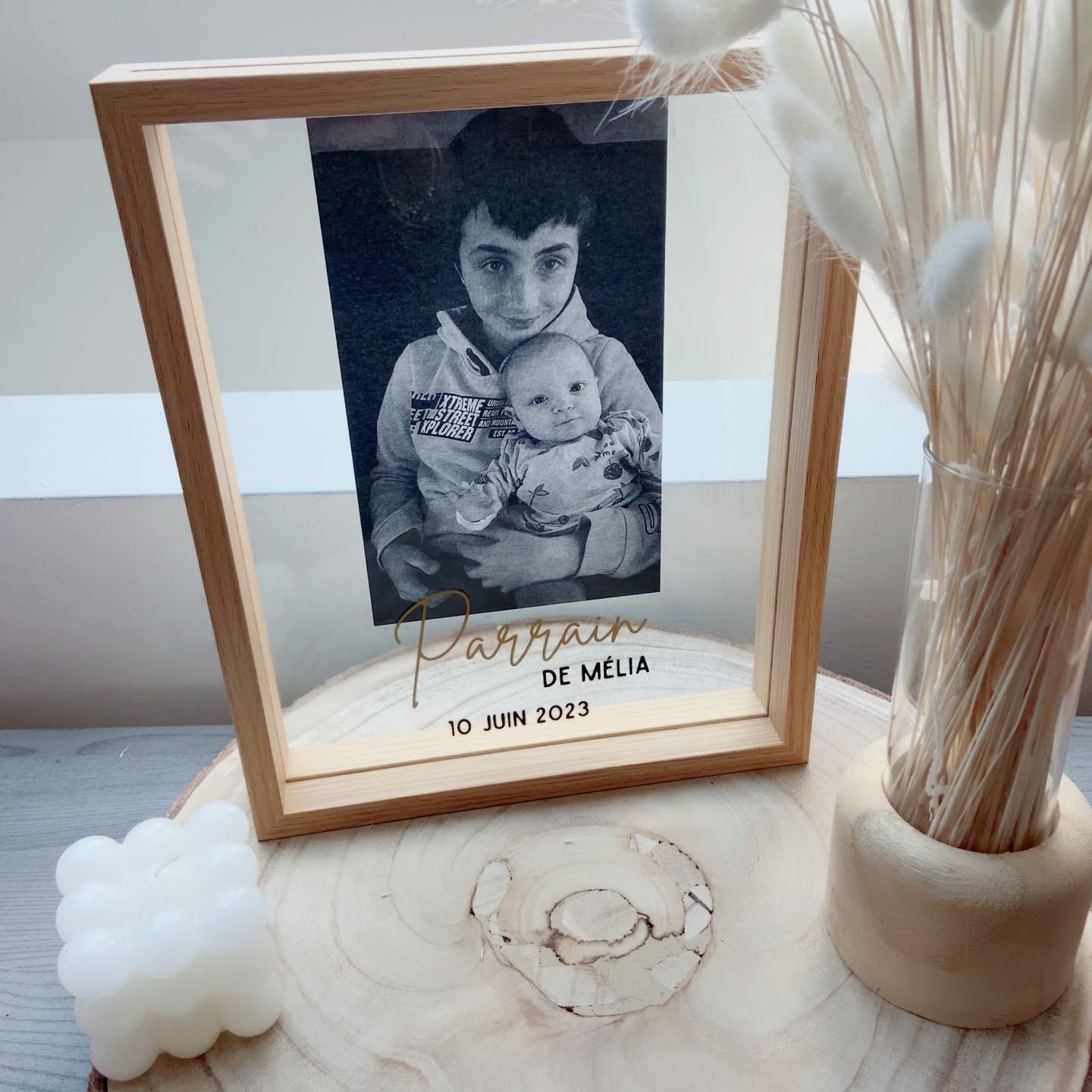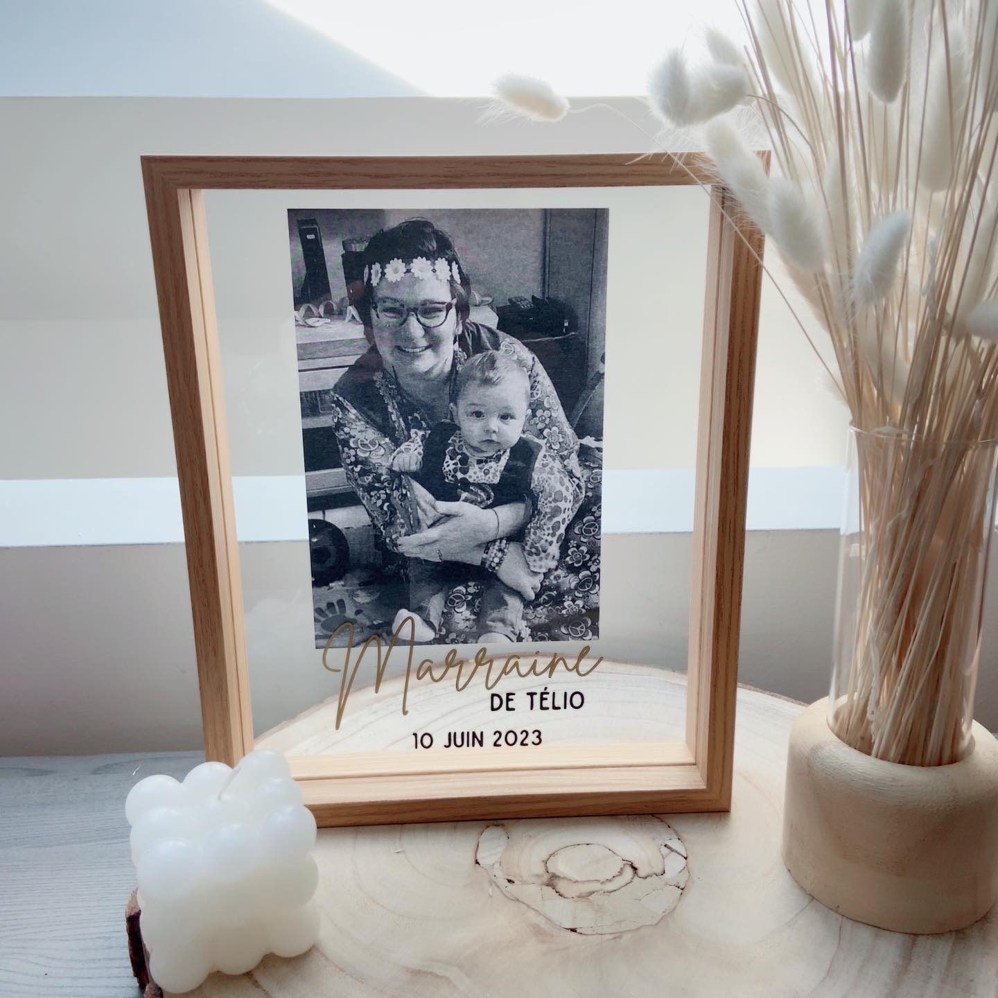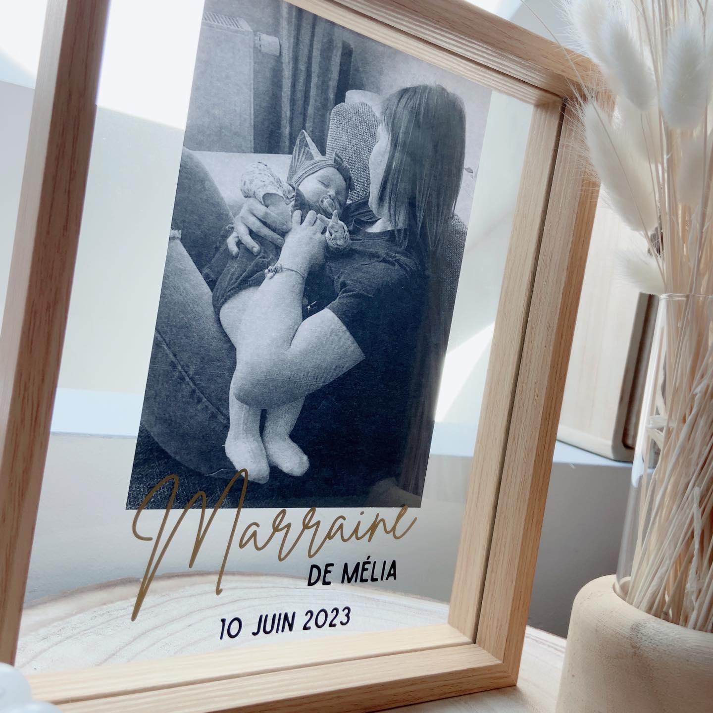 Un cadre élégant pour célébrer vos liens : famille, parrain/marraine, naissance, fête… La photo est placée derrière et l’inscription est posée sur la vitre pour un bel effet de profondeur.