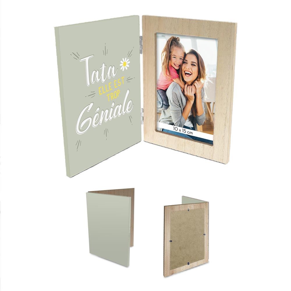 Un cadre photo double joyeux et tendre pour une tata gĂ©niale đ Avec son inscription « Tata elle est trop gĂ©niale », ce cadre en bois allie simplicitĂ© et Ă©lĂ©gance pour un rendu doux et naturel. Parfait pour offrir Ă une tante adorĂ©e, il dispose dâun cĂŽtĂ© photo (10Ă15 cm) et dâun second volet dĂ©corĂ© dâun fond vert pastel avec des fleurs et un message plein de gaietĂ© đŒ.