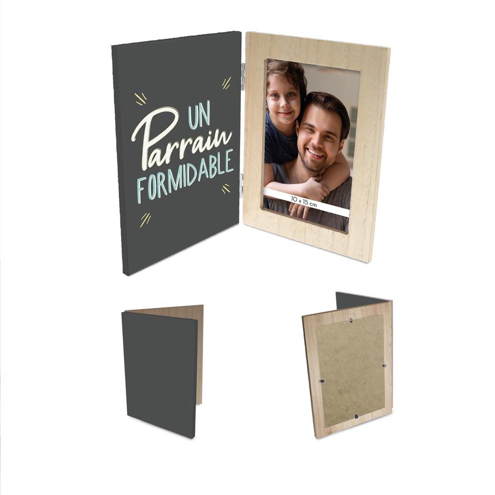 Un cadre photo double élégant et moderne pour un parrain formidable 💙 Avec son inscription « Un parrain formidable », ce cadre en bois est un cadeau plein d’affection et de reconnaissance. Son design sobre et contemporain s’adapte à tous les intérieurs : un côté pour votre plus belle photo (10×15 cm), et l’autre orné du message en bleu et blanc sur fond noir, pour un rendu chic et intemporel 🖤.