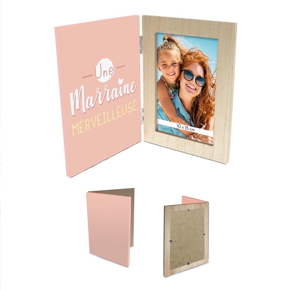 Un cadre photo double plein de douceur et d’élégance pour gâter une marraine merveilleuse 💖 Avec son inscription « Une marraine merveilleuse », ce cadre en bois naturel est une idée cadeau originale et affective. Il s’ouvre en deux volets : un côté pour une photo 10×15 cm, et l’autre orné du message coloré sur fond rose avec de jolis motifs blancs et rose foncé 🌸.