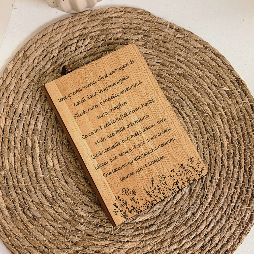 Un carnet unique pour une mamie, papy, marraine, parrain… ou tout simplement pour se faire plaisir. La couverture en bois est gravée avec le texte de votre choix, et vous pouvez choisir le décor : champs de fleurs (poétique) ou feuillages (plus sobre/masculin).
