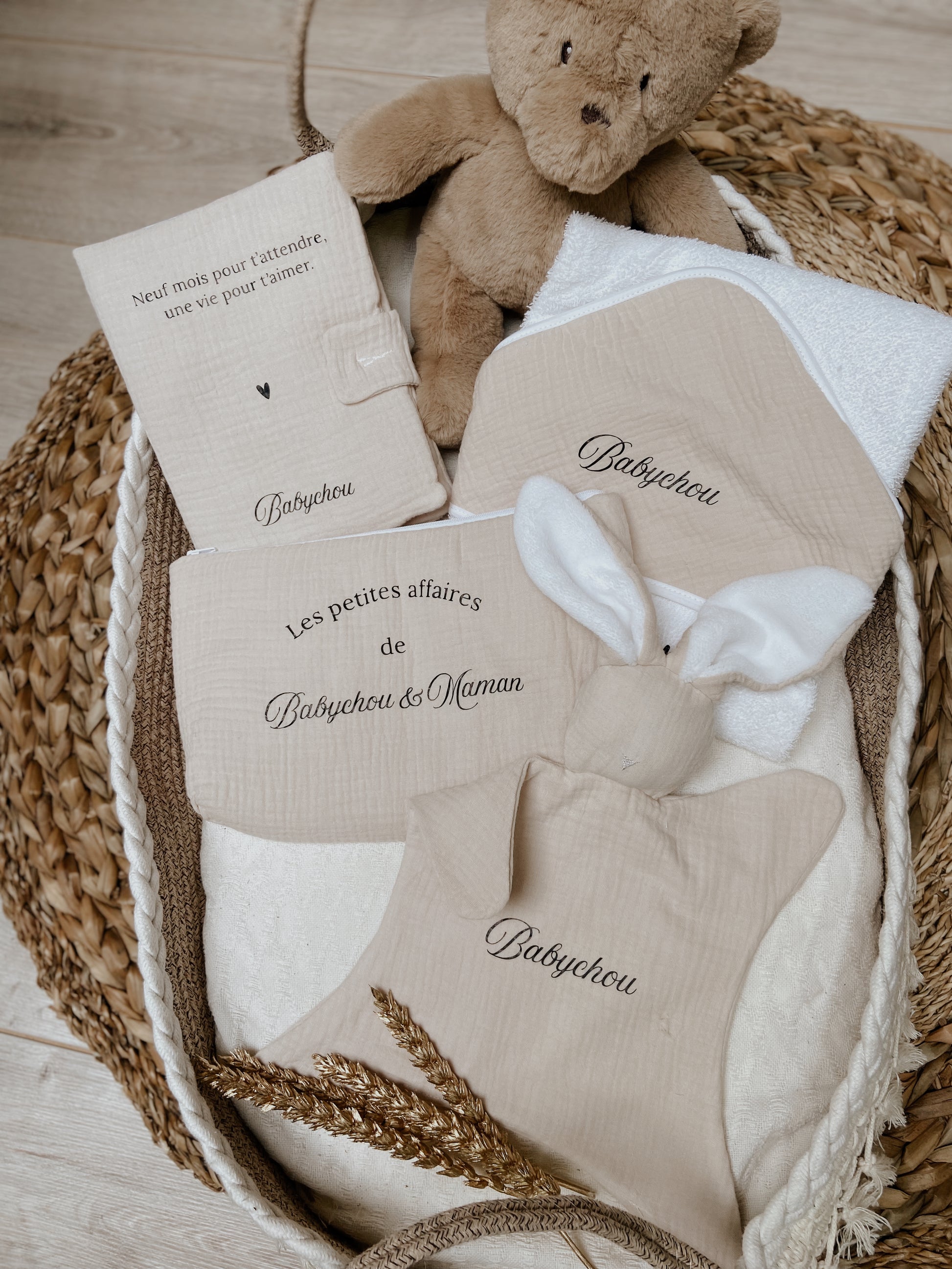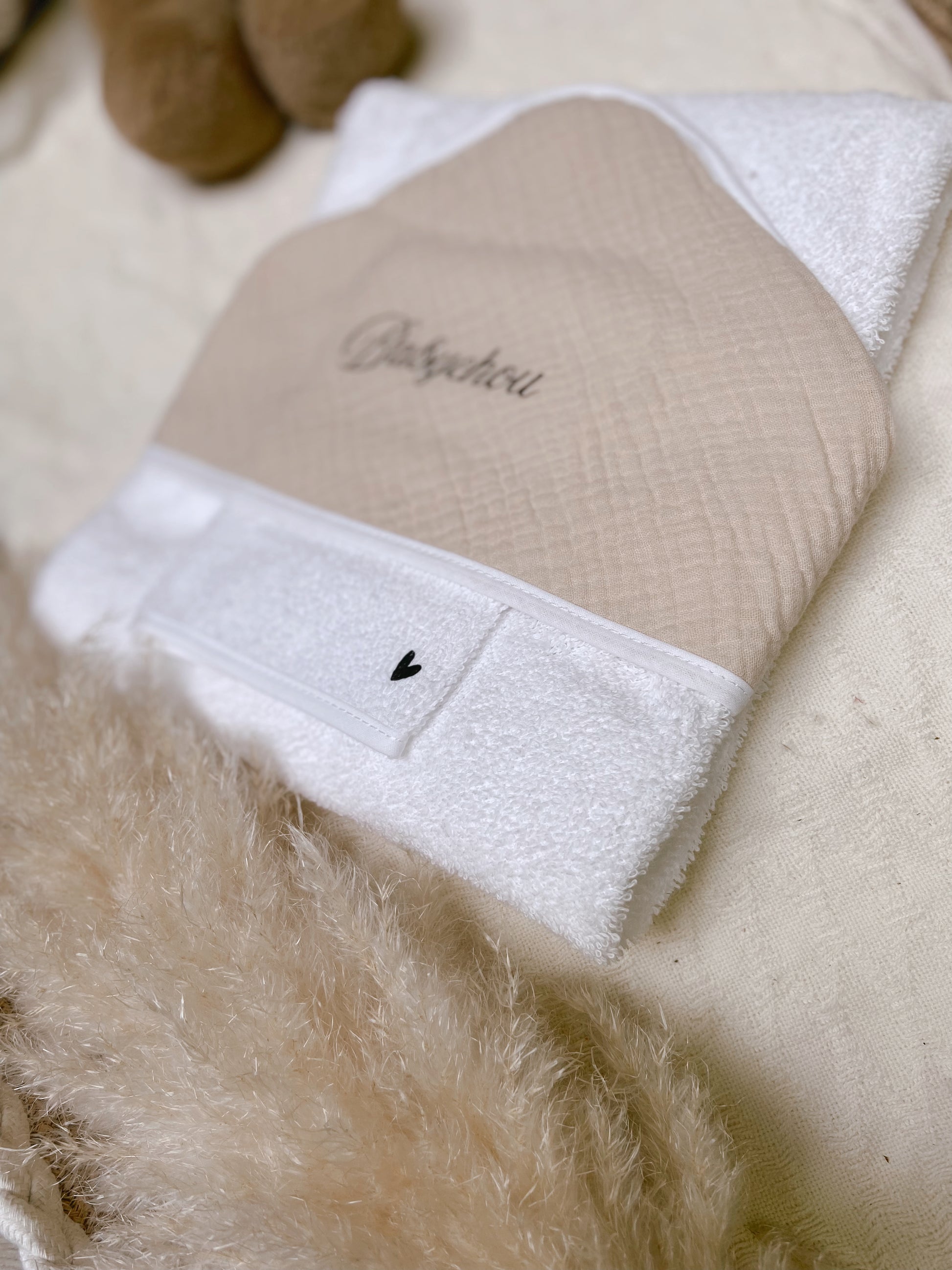- 1 cape de bain 70×70 cm (capuche en gaze de coton, reste en éponge)