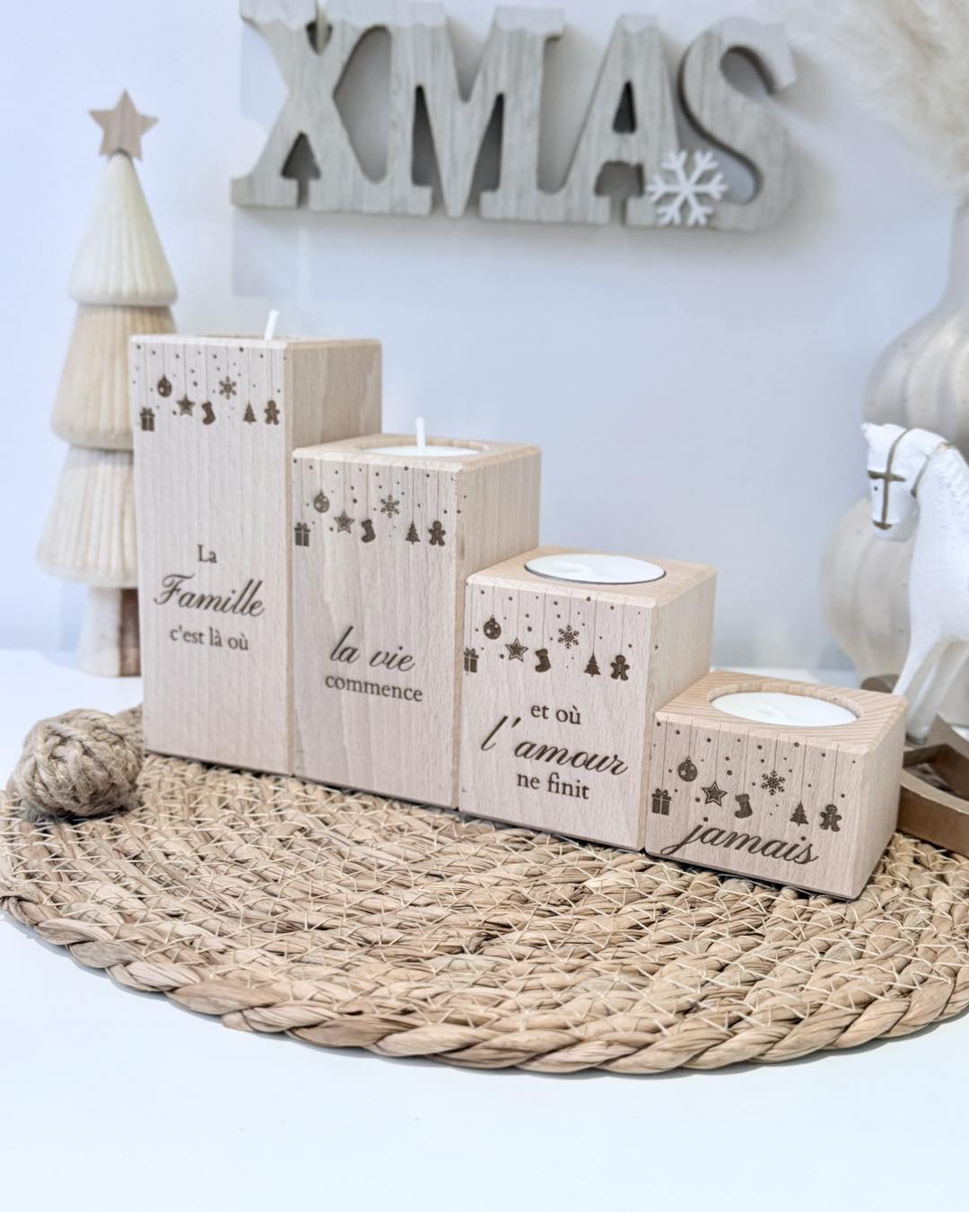 Ce lot comprend quatre bougeoirs en bois massif gravés et emplacements pour bougies chauffe-plat. À choisir en modèle Traîneau ou modèle Suspensions de Noël.