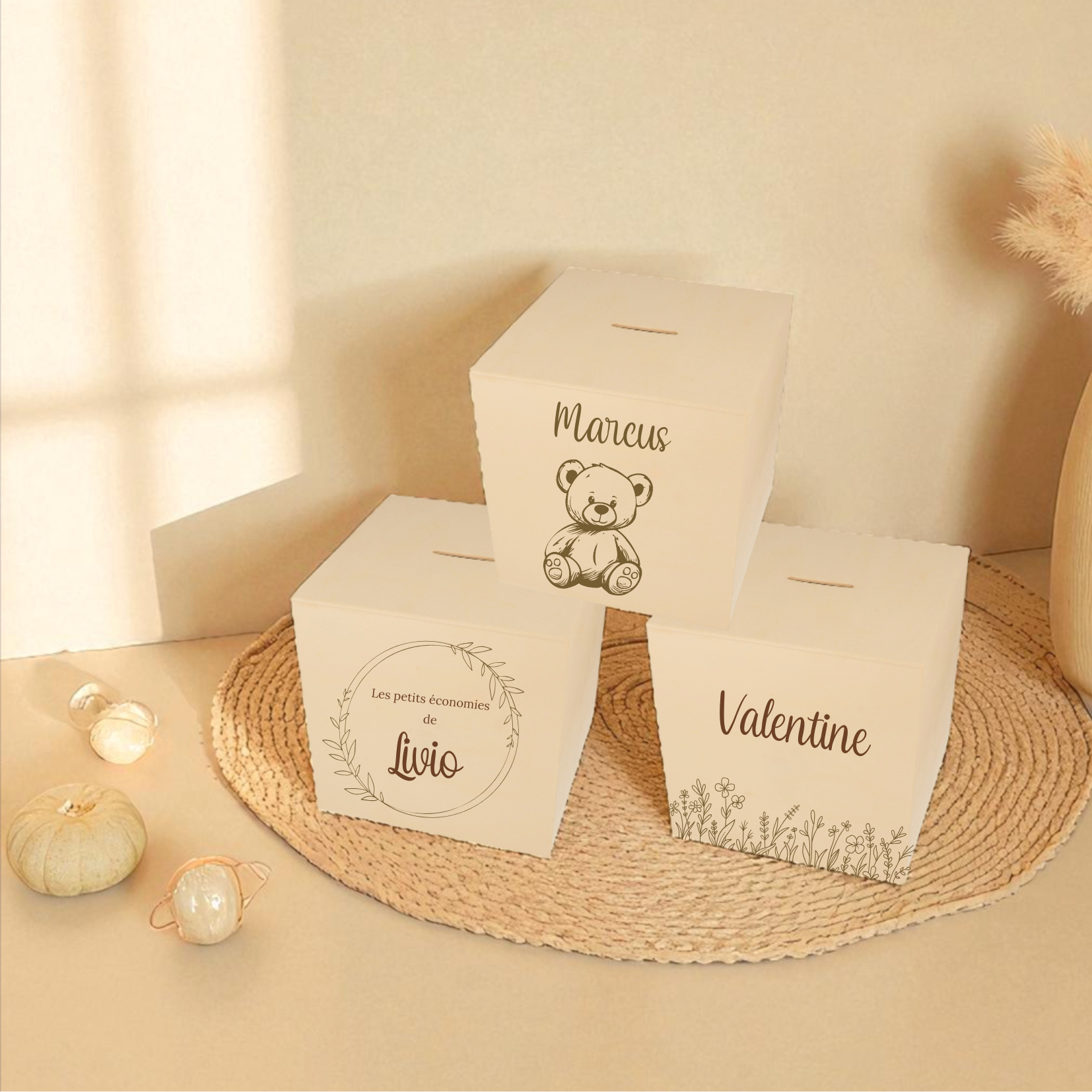 Une jolie tirelire cube en bois gravée pour garder précieusement les premiers petits trésors 💛 Idéale pour une naissance, un anniversaire ou simplement pour gâter un enfant avec un souvenir unique.